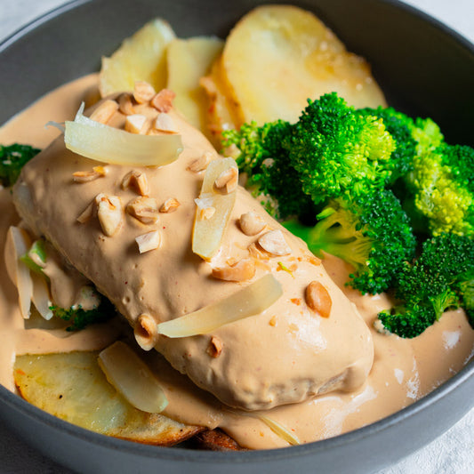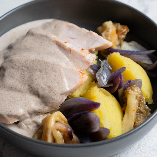 Para calentarlo en el horno, pasa la comida de la bandeja a un recipiente apto para horno y caliéntalo a una temperatura máxima de 150º.
