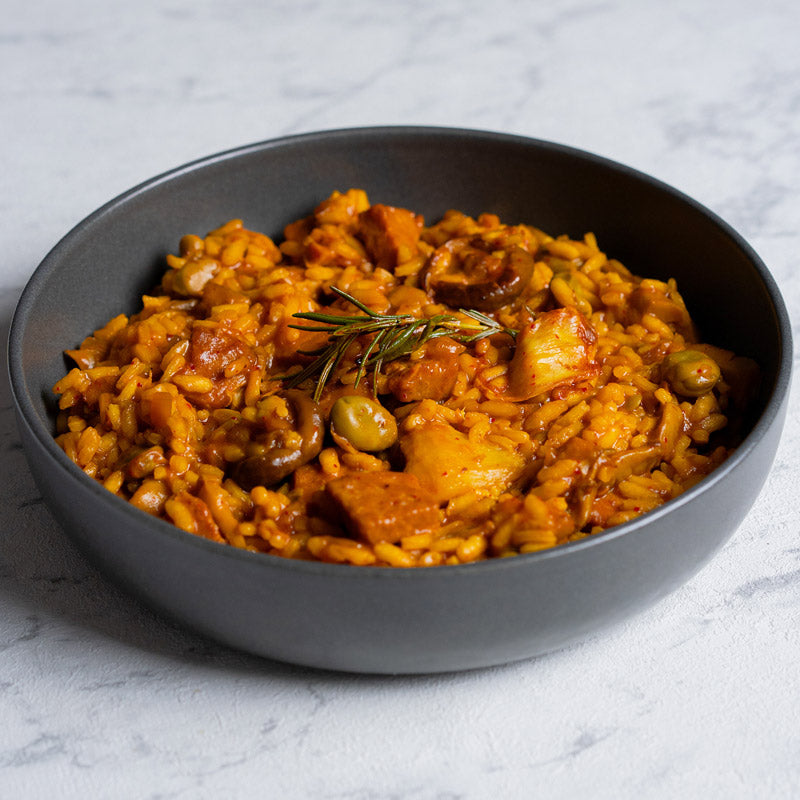 Caldo de pollo (agua, pollo, cebolla, aceite de oliva virgen, sal), arroz, presa de cerdo, cebolla, alcachofa, habas, salmorreta (ñora, ajo, tomate, jugo de limón, perejil, aceite de oliva virgen), aceite de oliva virgen, sal, romero, sazonador paella (cúrcuma, pimentón dulce, pimienta negra, tomillo, clavo, nuez moscada, perejil, romero, azafrán).