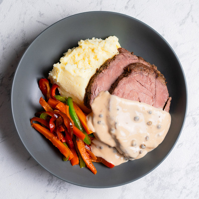 Carne de ternera, puré de patata (patata, nata (LÁCTEOS), mantequilla (LÁCTEOS), leche (LÁCTEOS), sal, pimienta), pimiento rojo, pimiento verde, cebolla, zanahoria, salsa pimienta (caldo de pollo (agua, pollo, cebolla, aceite de oliva virgen, sal), nata (LÁCTEOS), cebolla, caldo ternera (agua, grasa de ternera, extracto de ternera, caldo de hueso de ternera, sal, aroma natural, extracto de levadura, azúcar, almidón de maíz, zumo concentrado de setas, jarabe de caramelo de azúcar, maltodextrina (patata, tapioca), dextrosa cultivada, pimienta negra), coñac, pimienta verde en grano, aceite de oliva, almidón de maíz, sal, pimienta), aceite de oliva virgen, sal, pimienta.