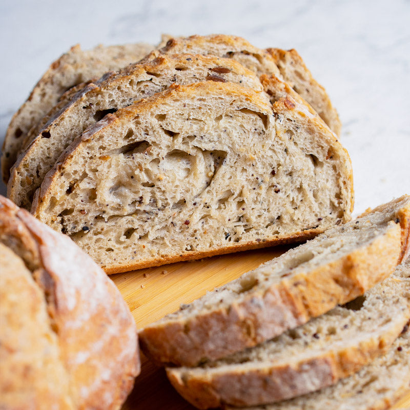 Harina de trigo (GLUTEN), masa madre (harina de trigo (GLUTEN), agua), mix semillas (calabaza, girasol, lino marrón, lino dorado, amapola, amaranto, chia, quinoa blanca, quinoa roja, sésamo (SÉSAMO), sésamo negro (SÉSAMO)), sal marina.