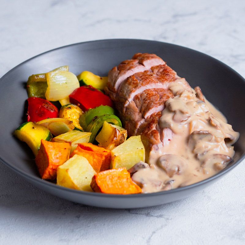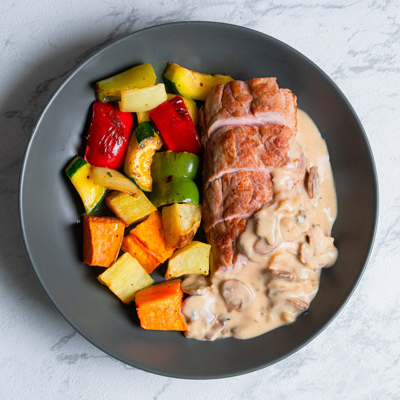 Solomillo de cerdo, salsa funghi (nata (LÁCTEOS), champiñón, caldo de pollo (agua, pollo, cebolla, aceite de oliva virgen, sal), cebolla, roux oscuro (GLUTEN), coñac, mantequilla (LÁCTEOS), sal, concentrado de carne (GLUTEN, APIO), pimienta), patata, boniato, cebolla, pimiento, aceite de oliva virgen, sal, pimienta.